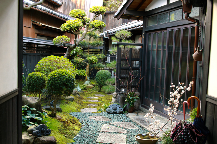 A courtyard garden between the wooden houses.