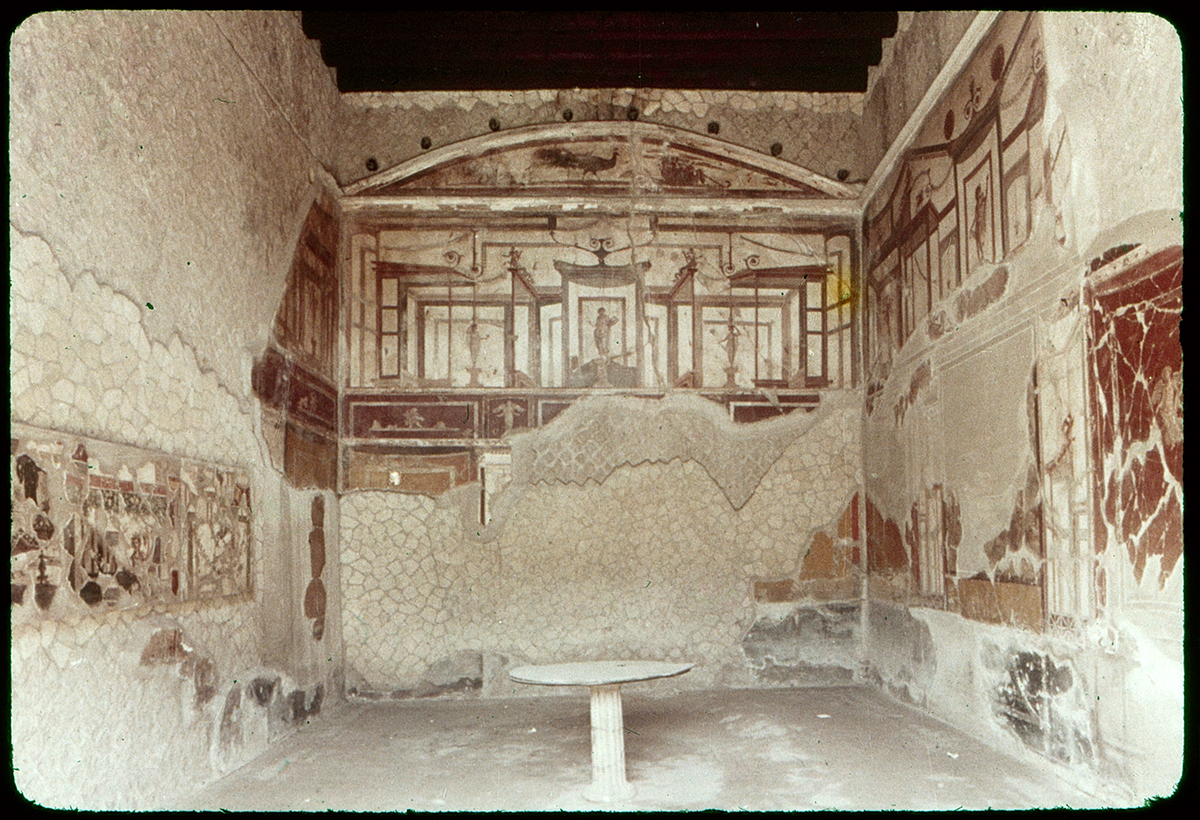 Faded wall murals from the dining room of the House of the Deer. These people had money. Poor Romans lived in flats and ate at takeaways and pubs. Three or more couches with cushions would have been arranged around central low tables (hence triclinium for dining room in Latin). For entertaining, food would be served as finger style canapes, eaten relaxing on the sofas. Eating sitting up at a table was a sign you were in a rush and nobody important.