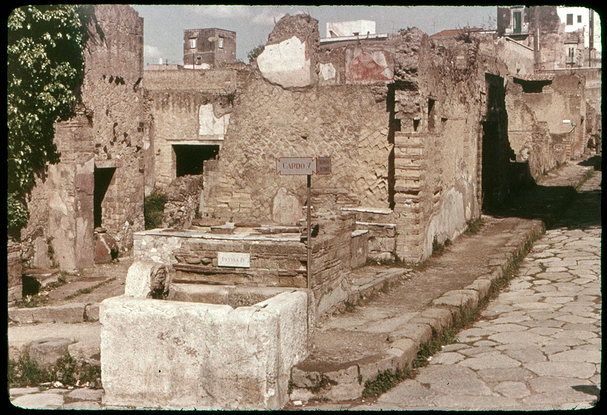 Street fountain and remains of some shops and workshops. There were public wells and fountains fed from the aquaducts for everyone to use, and richer people had home plumbing. Unfortunately a lot of the pipes were made of lead.