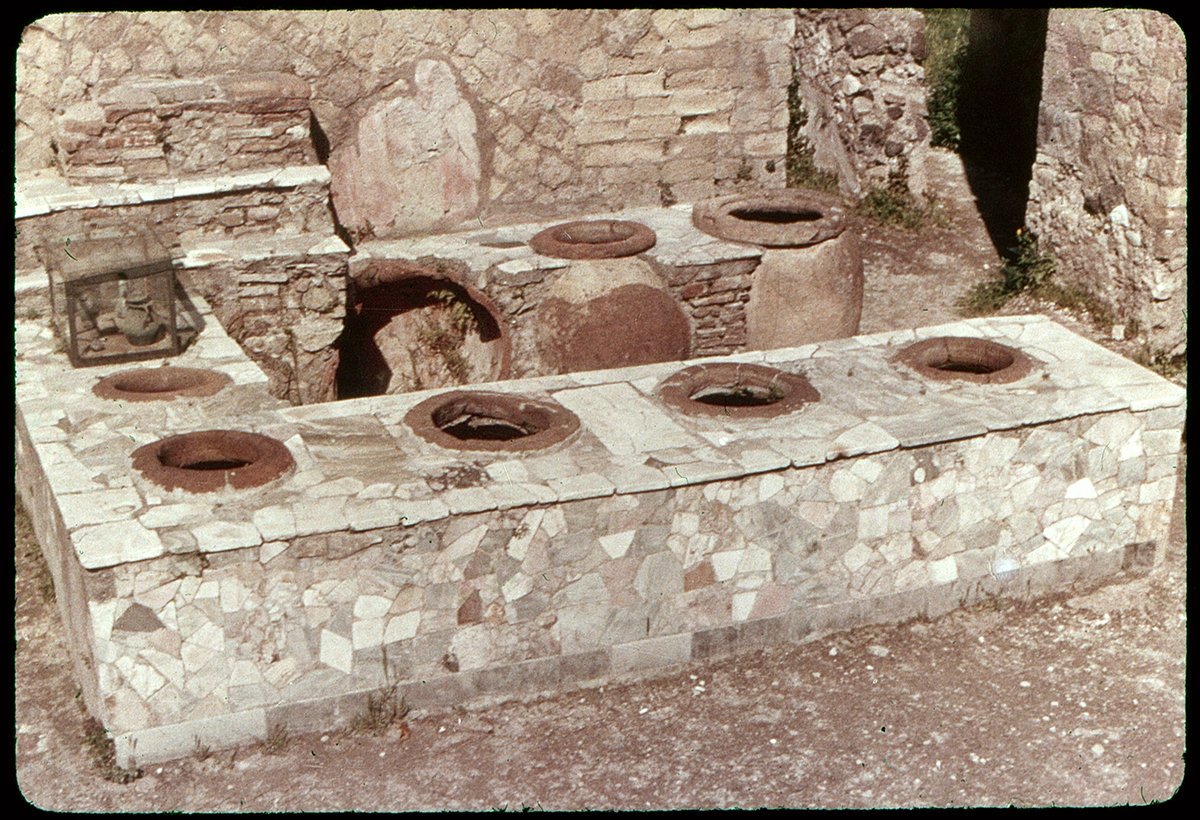 A thermopolium – a Roman takeaway – this is where ordinary people would get meals. The holes are storage jars. Lots of mulled wine, lentil and chickpea dishes, baked cheeses, and a dish similar to pizza on the menu. With plenty of garum– fish sauce to drizzle over everything (it’s pretty much identical to modern Thai fish sauce). No tomato, no peppers, no citrus or potatoes though, those were yet to come. Poor people didn’t eat much meat, it was expensive. A good source was sacrifices at temples if they could get it. Conveniently the bit the gods liked from sacrificed animals was the gristle and bones, leaving the congregation free to eat the rest.
