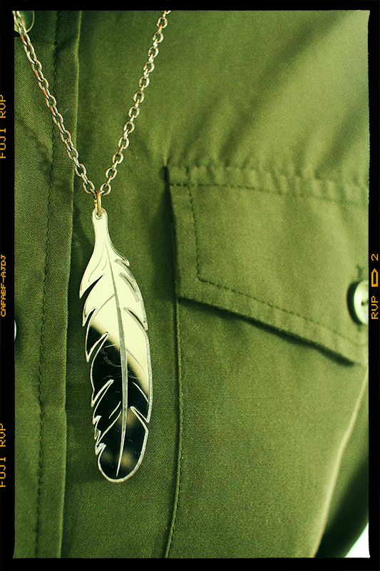 Here is a closeup of the necklace. Mika the designer is a friend of a friend who lives in Sweden. I bought two of his acrylic necklaces a while back (the other is the “I’d rather drown” pennant), and I’ve found the feather one has become a favourite that I wear more than any other item of jewellery.