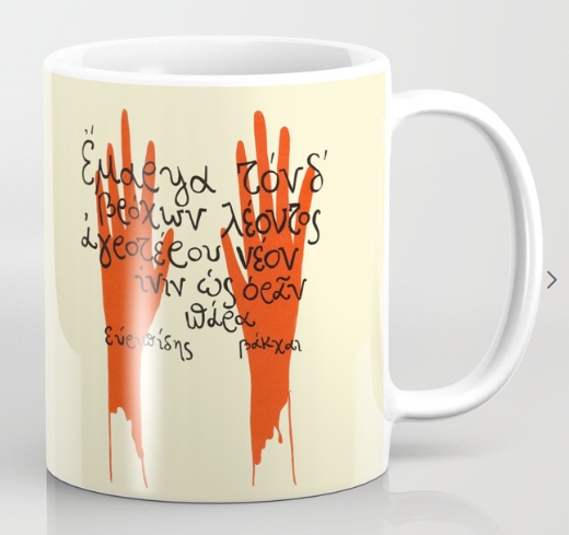 I have Bacchae prints available again. The text says “I caught this young lion myself without a trap”. Based on the scene from Euripides’ Bacchae where Pentheus’ mother tears her own son’s head off with her bare hands while under Dionysus’ spell and parades it round the stage. Available from me as a print here for £6 or £12 depending on size. Ideal festive gift for all, look how red it is.