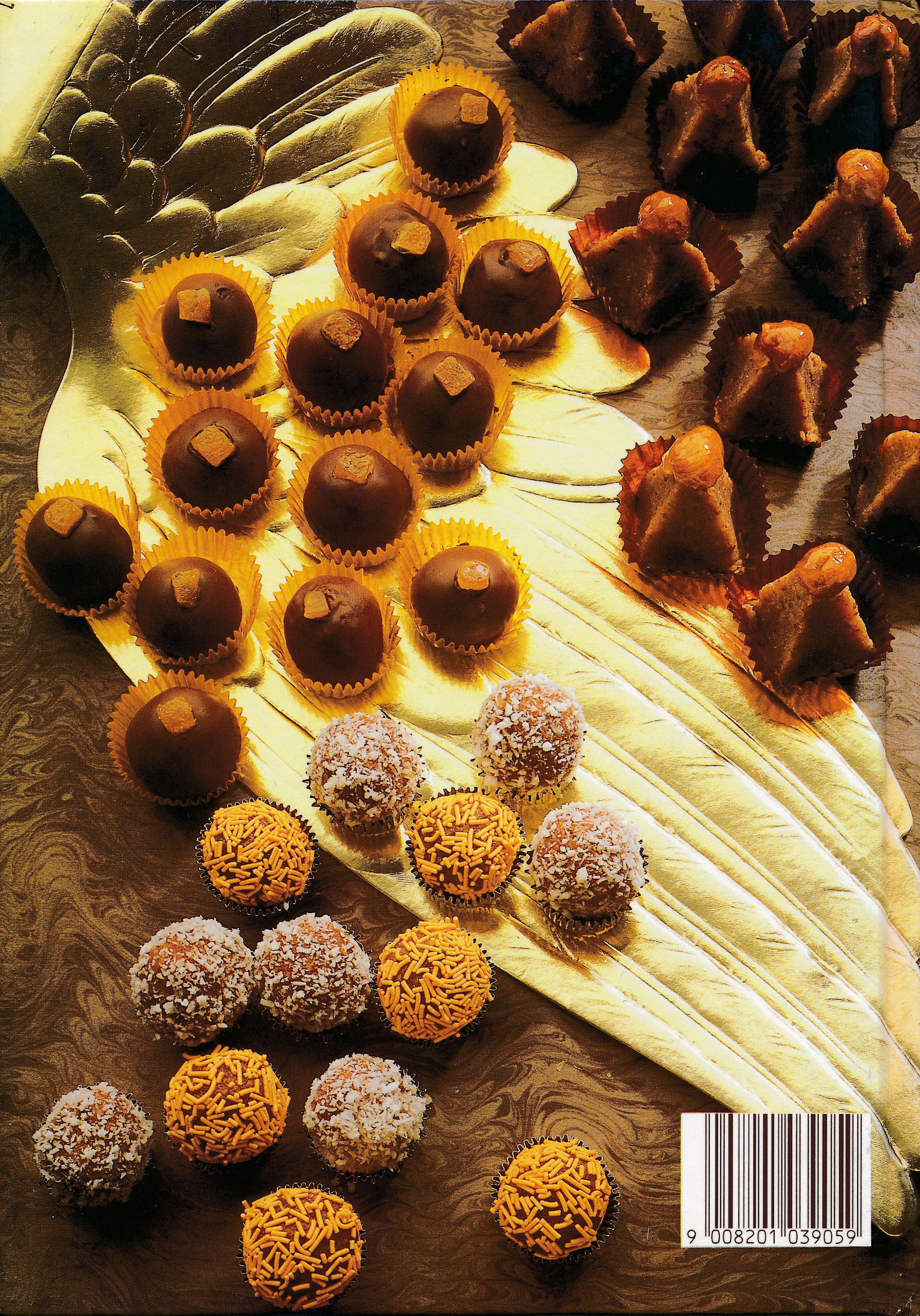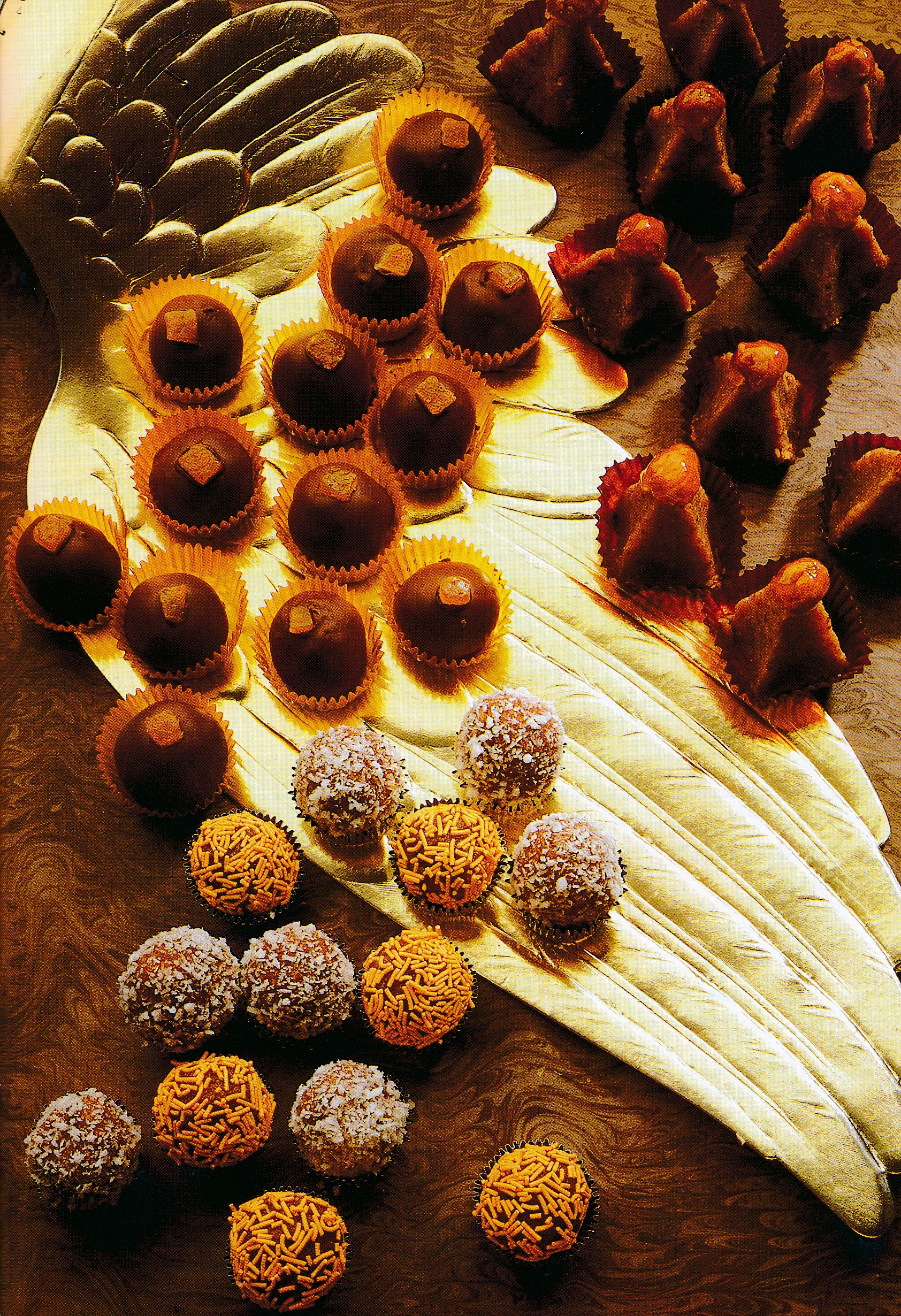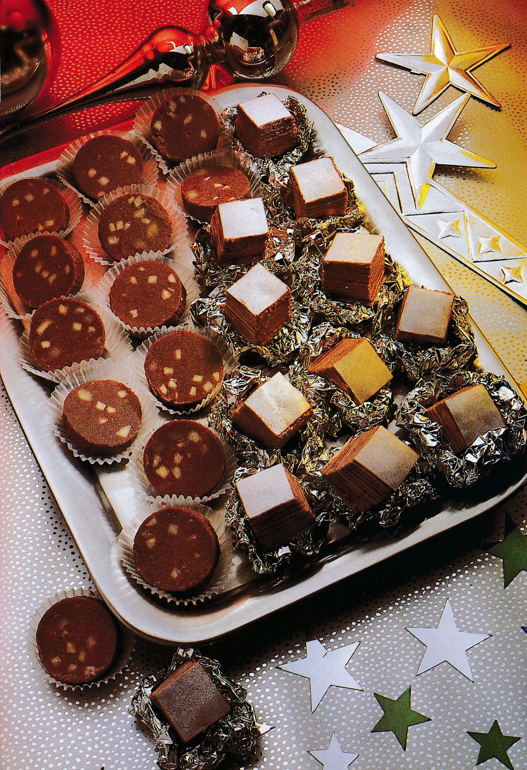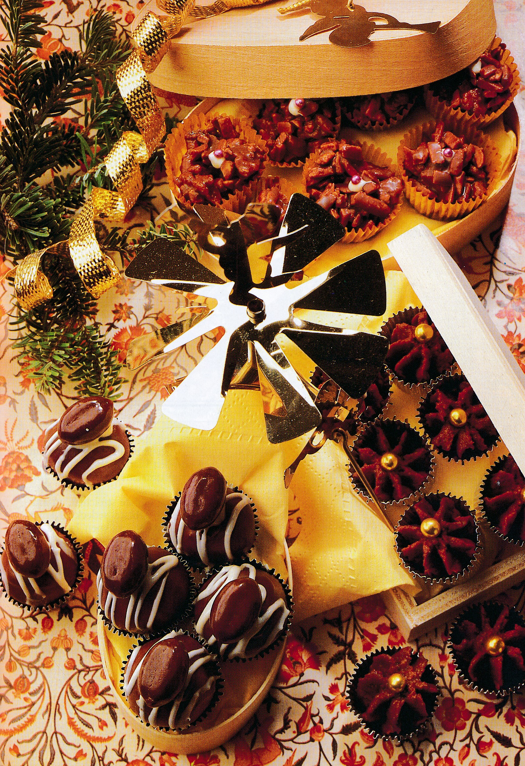 The pyramid truffles are made with marzipan and chocolate liqueur, the ones with sprinkles and coconut are rum truffles, and the chocolate ones have a glacé cherry in the middle.