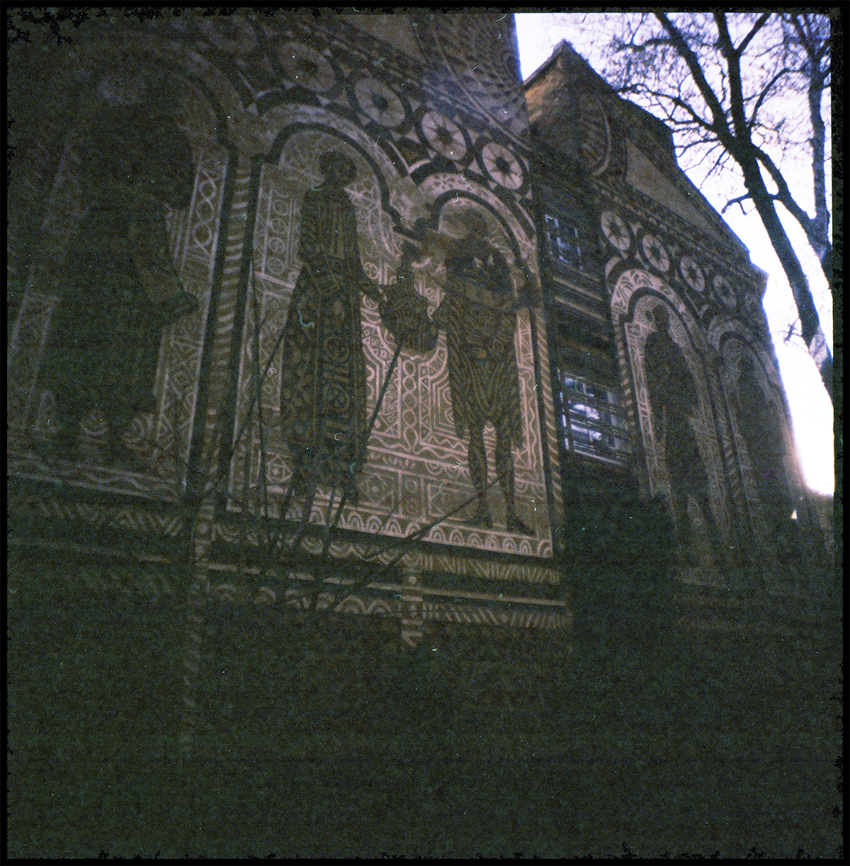 A multiple exposure of the cathedral. The film is some kind of Kodak slide film, cross-processed.