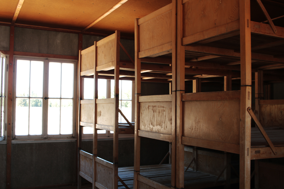Each of the thin, uninsulated huts was filled with bunkbeds. Originally each bedroom had 50 people crammed in. By 1945 there were 200 per bedroom. Each hut had multiple rooms, so there could be thousands of people crammed in there. The SS guards took sadistic delight in severely punishing the prisoners for minor infractions in bedmaking or floor-polishing. The managers of the camp of course lived in luxurious mansions nearby- you can still see them from the bus.