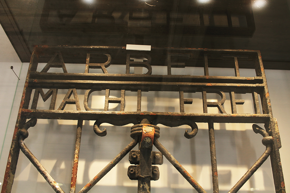 This is the original gate- the one now standing is a replica. The original gate was there until it was stolen a few years back. It later turned up in Norway and is now in a locked cabinet. I don’t even understand who would want to steal a concentration camp gate.