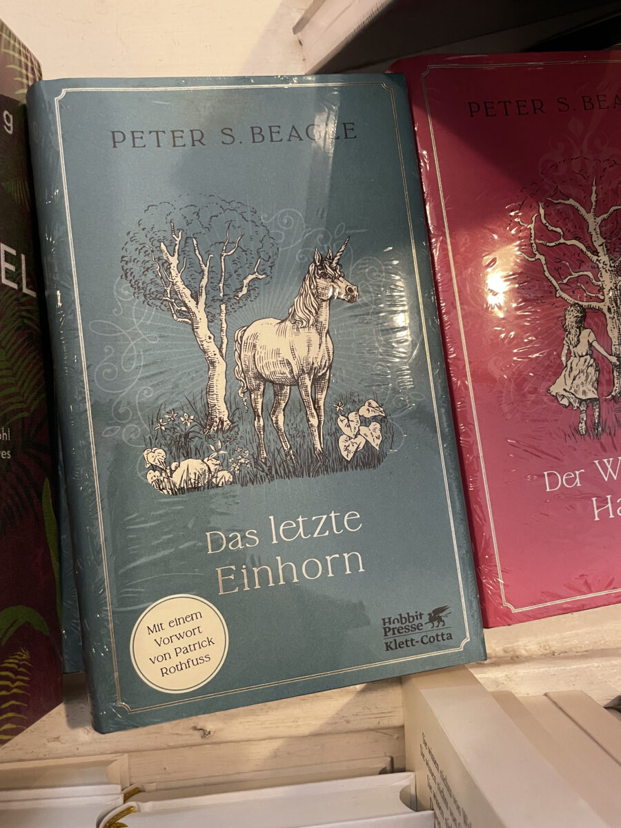 When I left the supermarket and walked back to the hotel, along the way there was a new bookshop on the square, which hadn’t been there on my previous visits to Graz. In the window was a handsome German hardback edition of the Last Unicorn book. Fate was telling me to buy it. I told the owner of the shop that I was just in Spar, and they were playing the theme tune, but she had no idea it was a film. She had just ordered it for the shop because it looked like a cool book. I ended up with a matching volume of the sequel in German as well.