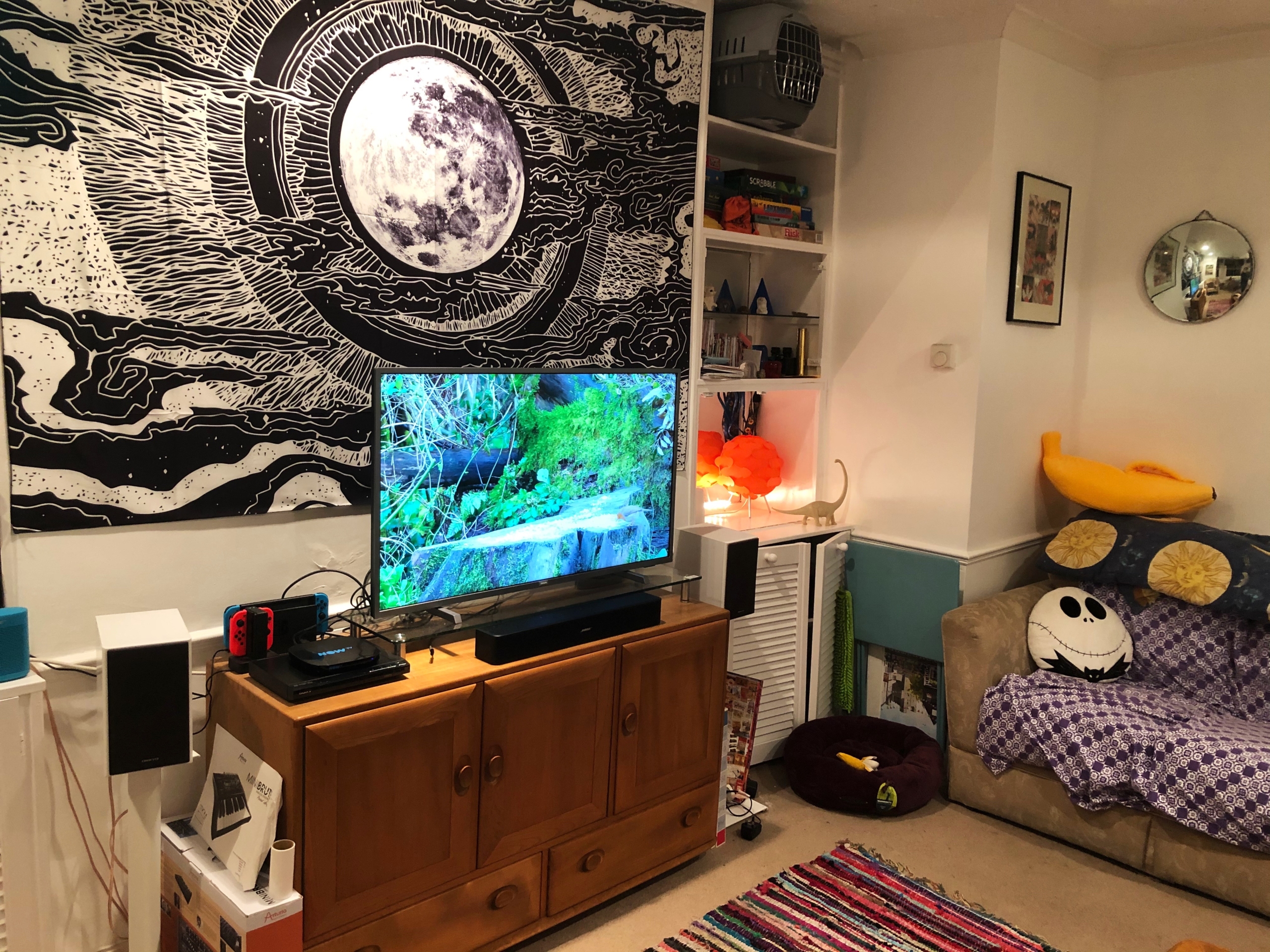 The ebay moon tapestry hides a multitude of sins- in this case ugly metal bolts for wall-mounting a tv. I knew if I tried to remove them a giant chunk of plaster would come off the wall. The walls were also painted brown when I moved in. It took a lot of coats of white to cover up.