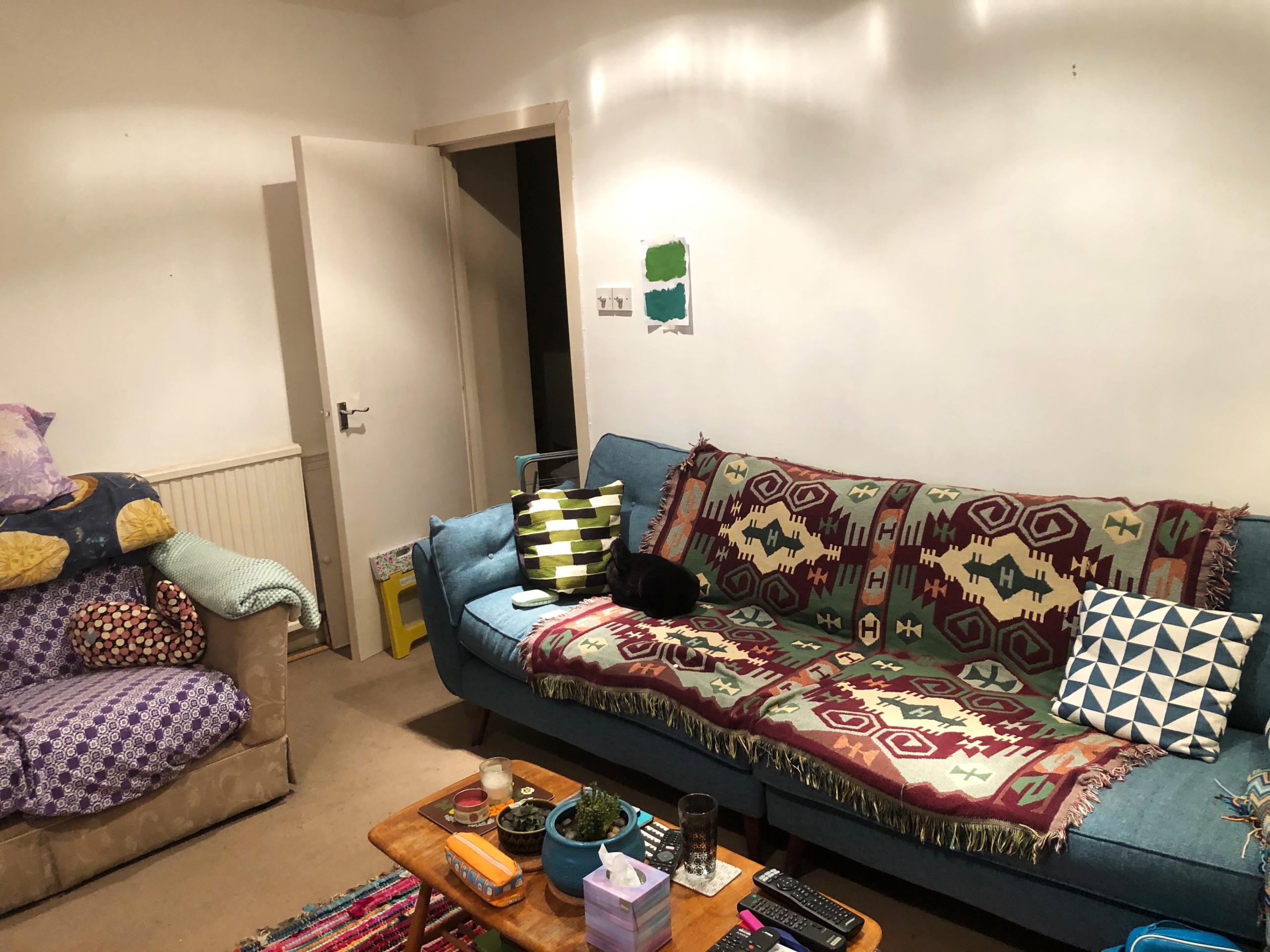 This wall still has lots to do. I’ve got a load of prints to go on the wall, but not had the time or money to get frames. That will have to wait. The piece of paper with paint samples is from where I was considering painting the walls green. I decided in the end that I liked neither colour.