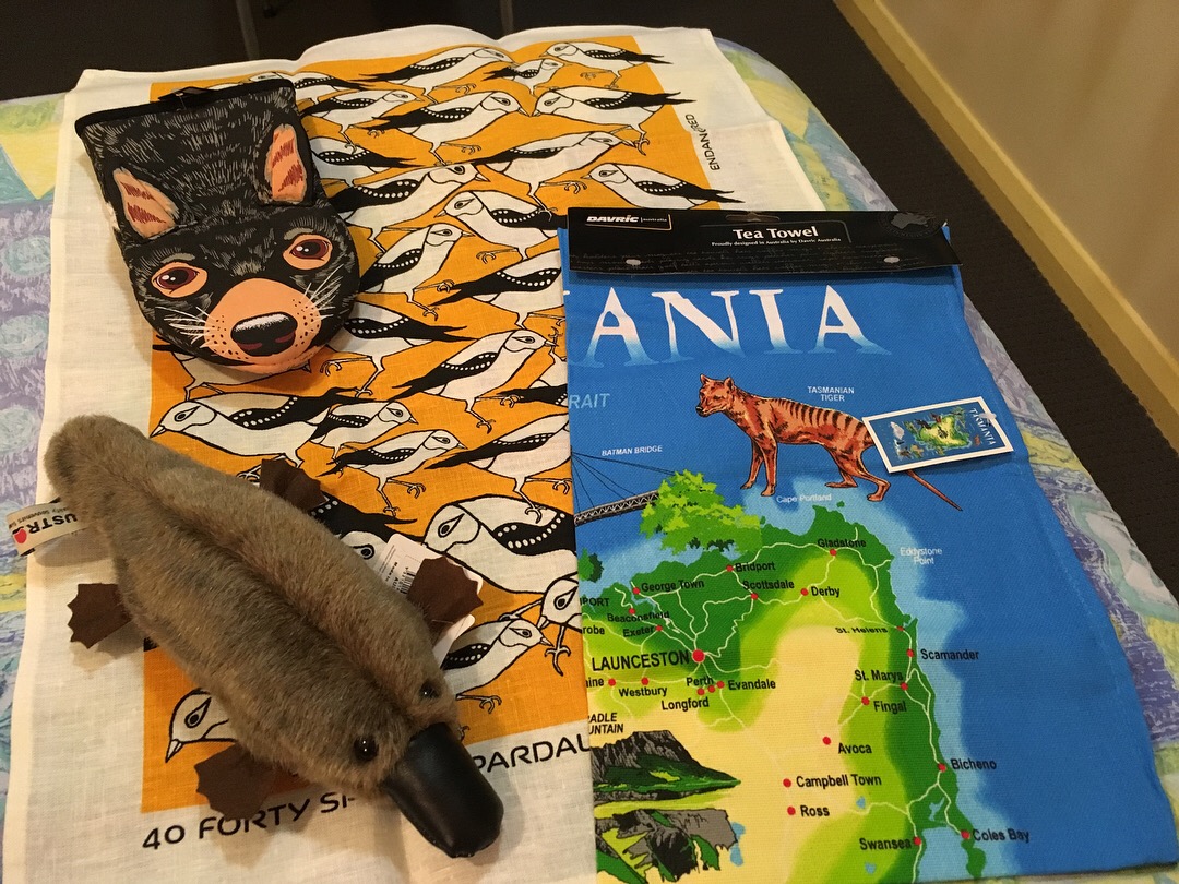 Some gifts I got for people from a street market in Hobart. The Tasmanian devil is an oven mitt. (The tea towels were for me)