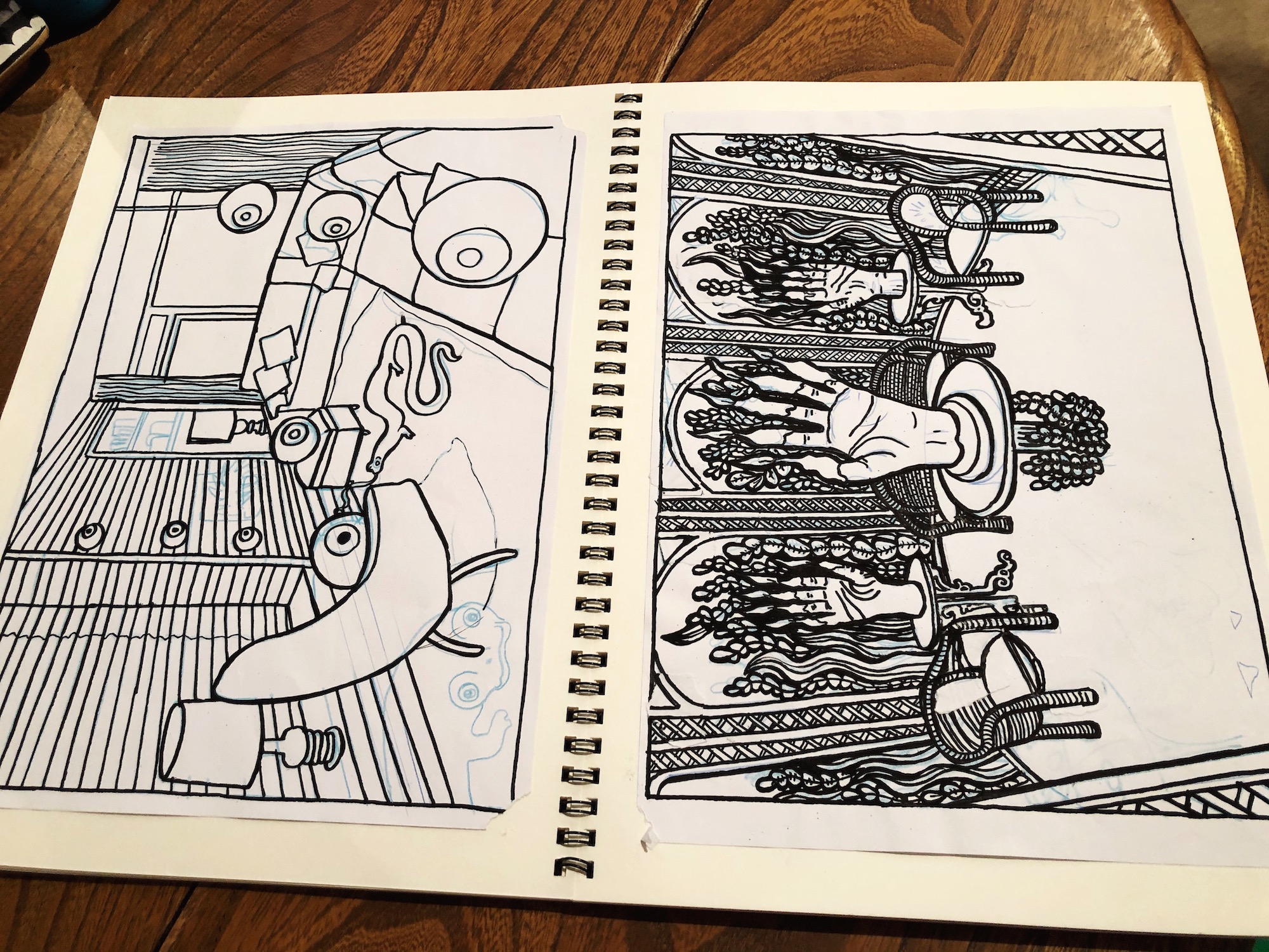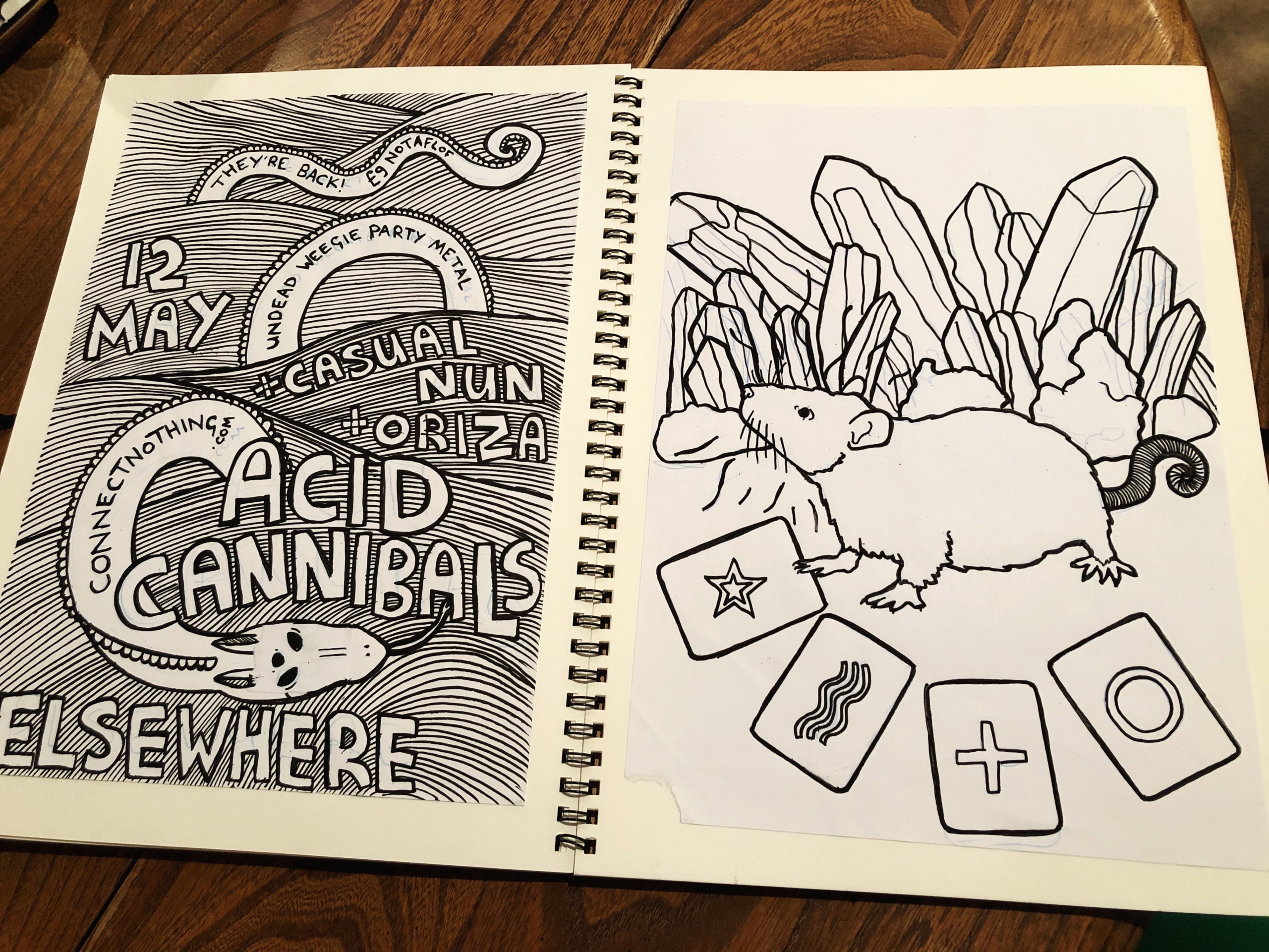 I had a whole folder full of artwork masters, so I decided to stick them into sketchbooks this afternoon (these kraft paper folio-sized books are around £6 from Muji). I tend to draw the line artwork by hand with a non-photo blue pencil and posca marker, and correct mistakes/add the colour digitally. You can see a tutorial of how I do the colour here.
