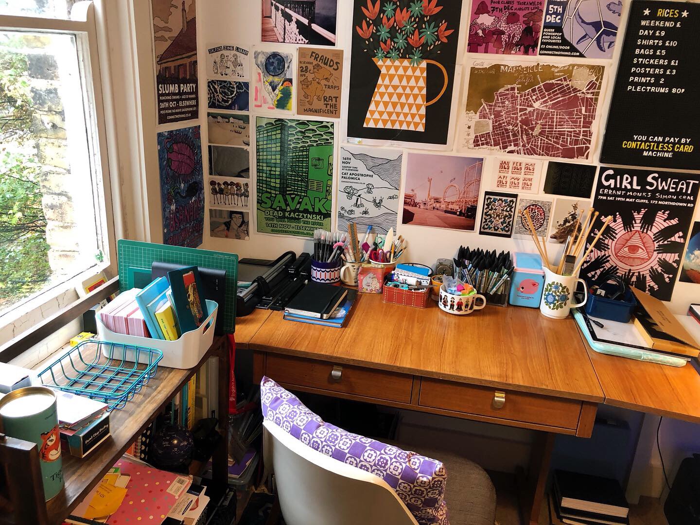 In the previous location I didn’t have space to spread the table leaves out. Now there’s space to put aside things like the guillotine or graphics tablet, which get frequent enough use to not be worth putting away, but are also annoying to leave in the centre of the desk. The wall decorations are a mix of my own photos and poster designs, and things people have sent me- like Giz’s falafel map of Marseille.
