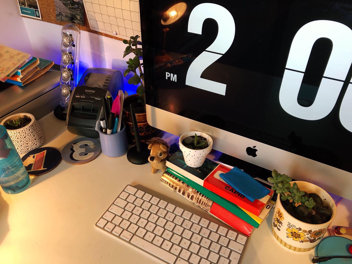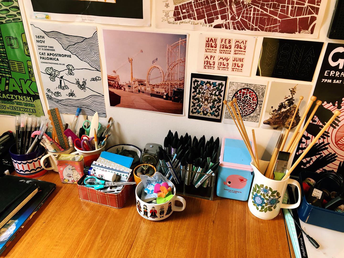 Assorted pens and scissors and things. Ironically I guess I actually do a lot of the colour in my artwork digitally. The desk bin for paper scraps came from eBay. I ordered a plain one, and they sent me one with a weird pig saying “tomorrow is waiting for your smile”. It’s actually a little broken now, but I like it so much I don’t care.