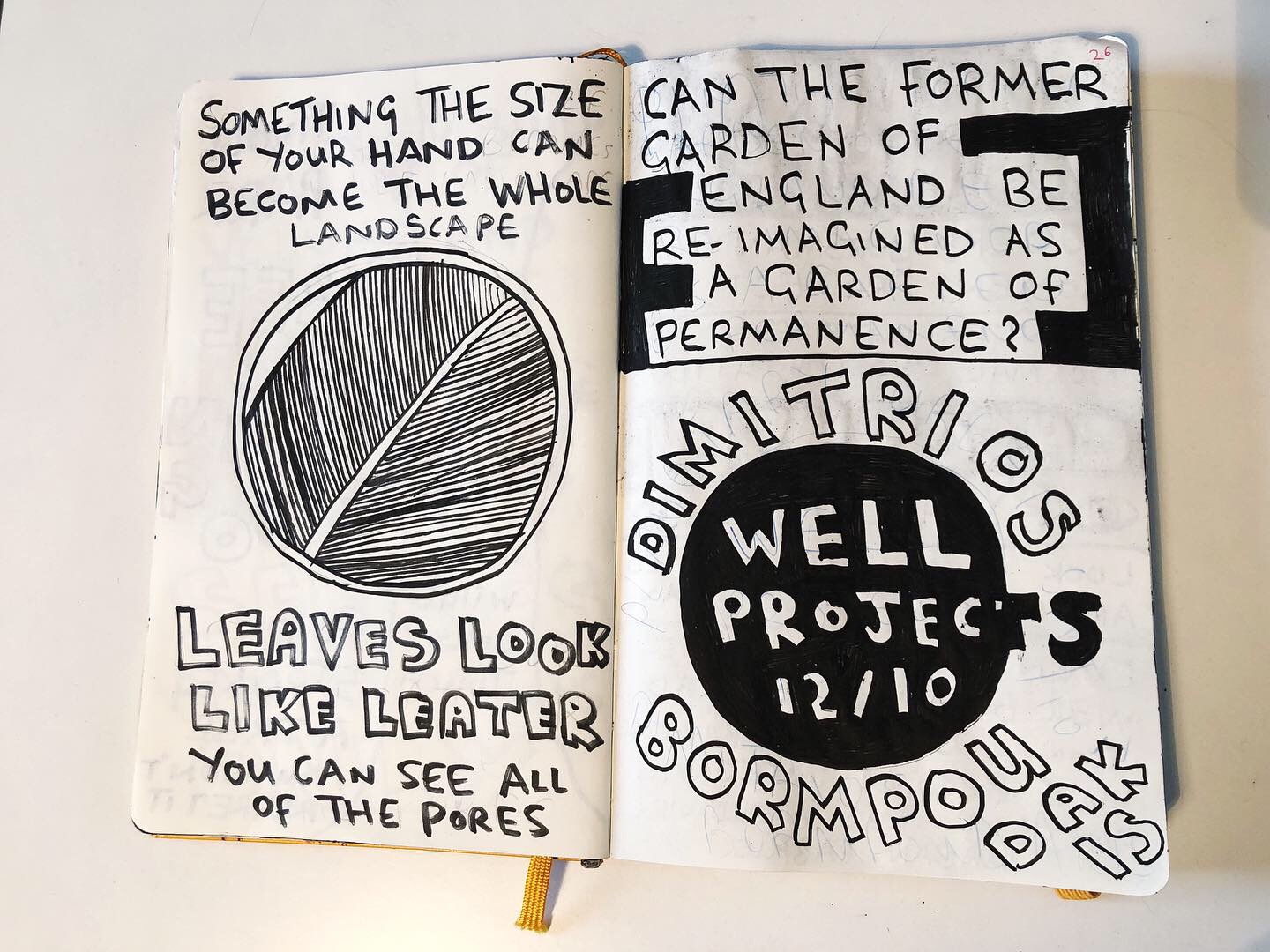 Yesterday I went to a talk at Well Projects from anthropologist/sound artist Dimitrios Bormpoudakis from the University of Kent as part of A Cut From Sharp Grass, “a visual art exhibition & series of public events developed in response to the increasingly urbanised, networked & technologically integrated landscape of Kent”. Here’s my sketchbook notes from the talk.