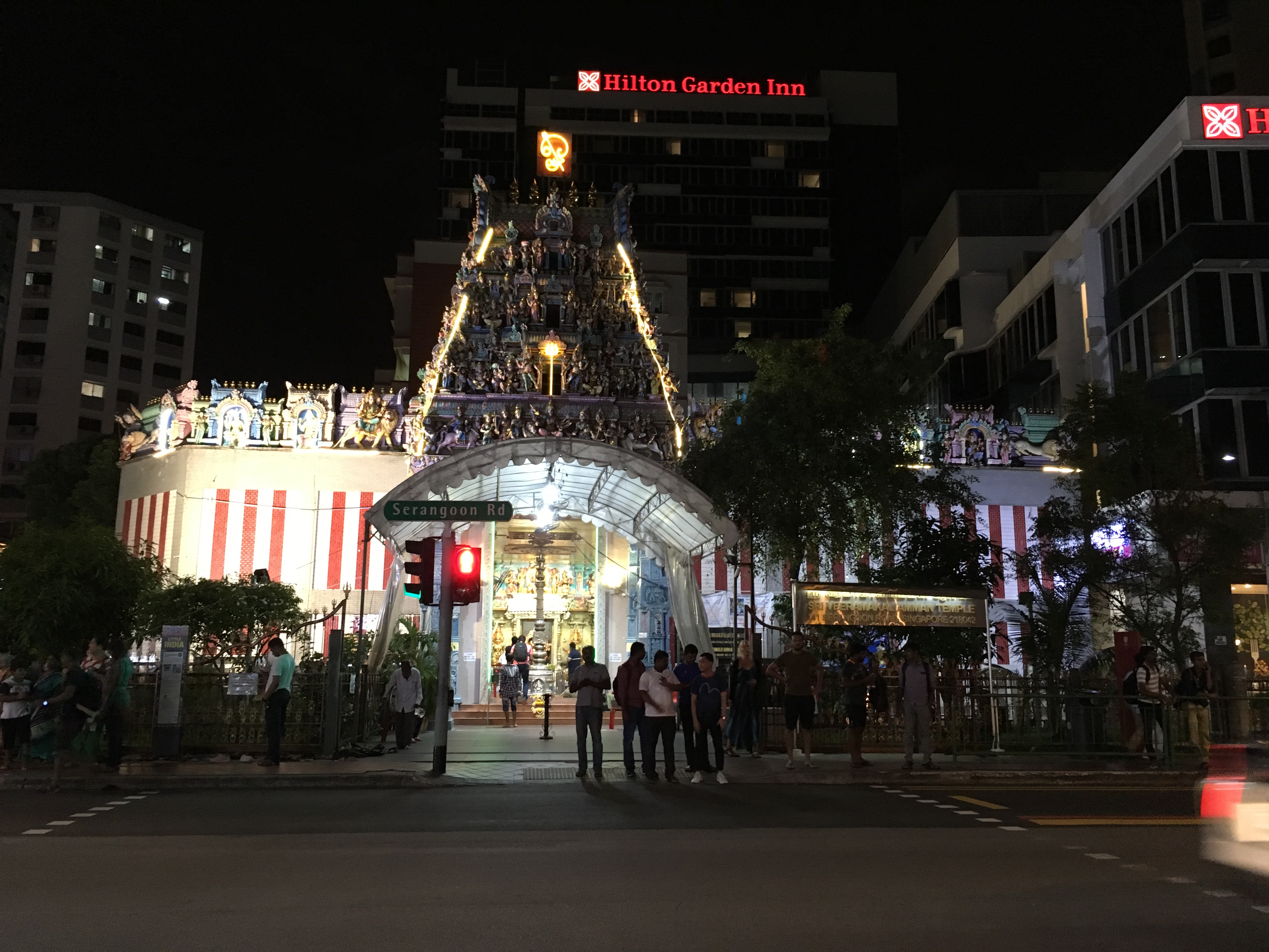 Hindu temple next to a Hilton hotel.