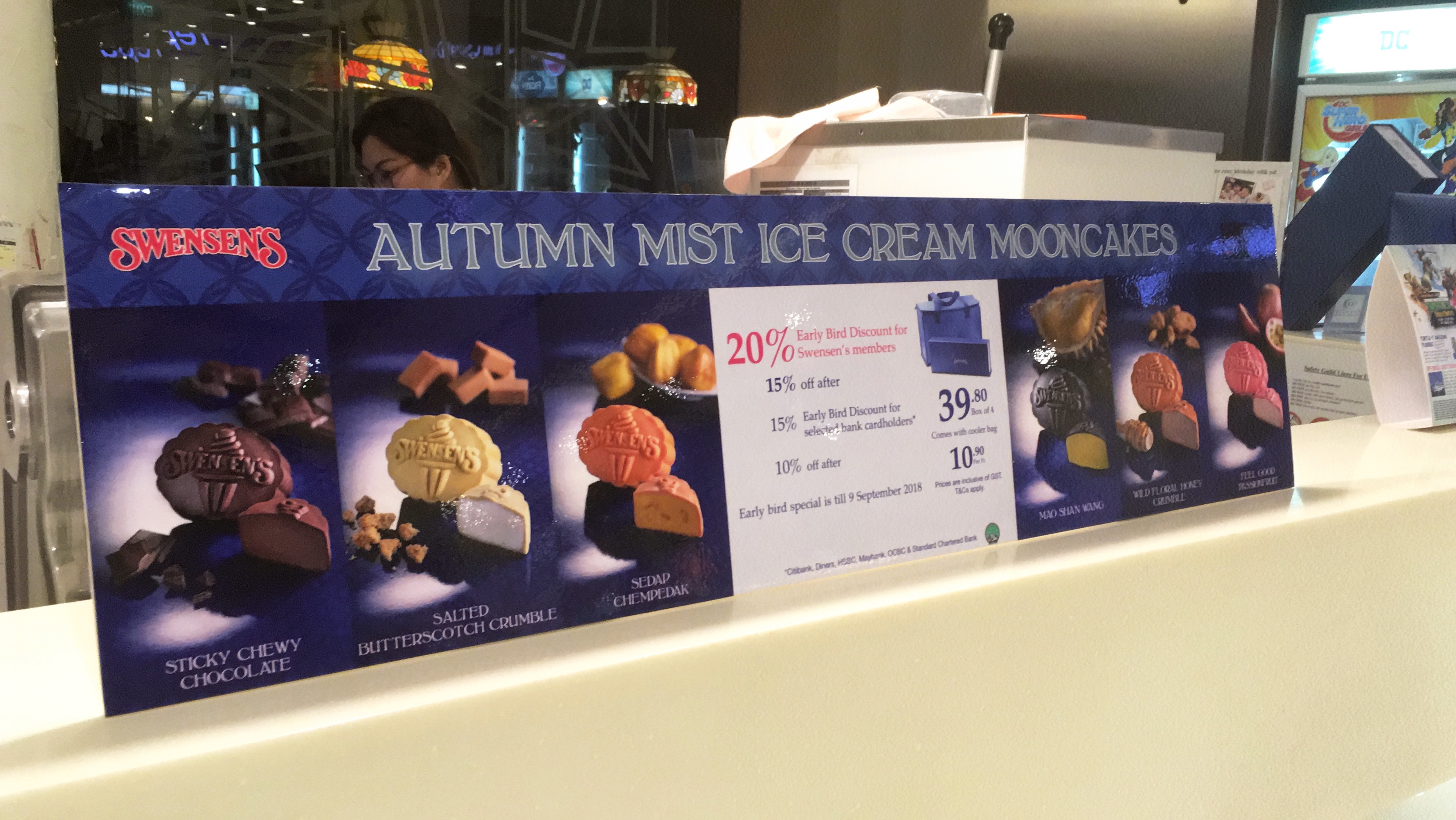 September is Moon Festival time in Chinese culture. These mooncakes are a seasonal speciality (although the original recipe has red beans instead of ice cream). Swensen’s is an odd one- an American chain that seems to have died in the US but is everywhere in Singapore, with all their branches decorated in that Tiffany Lamp style that was all the rage in the 1970s, like something from the Cheers set.