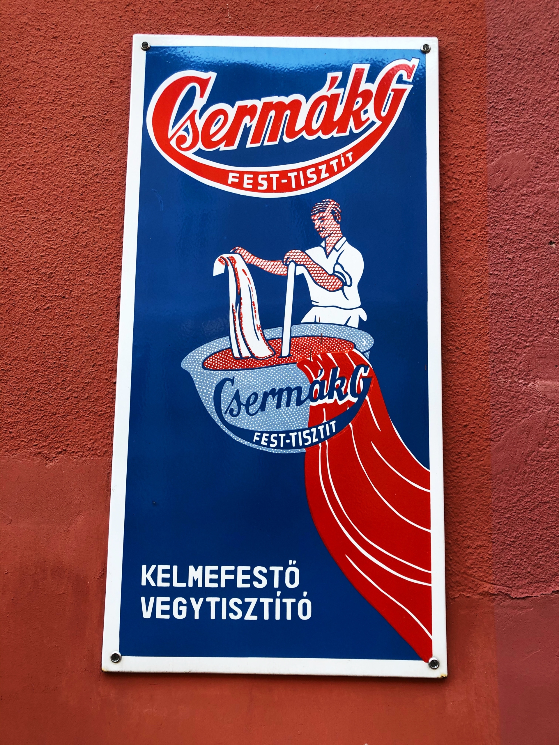 There’s also lots of vintage street signs in Győr. This one says “fabric dyeing and dry cleaning”.