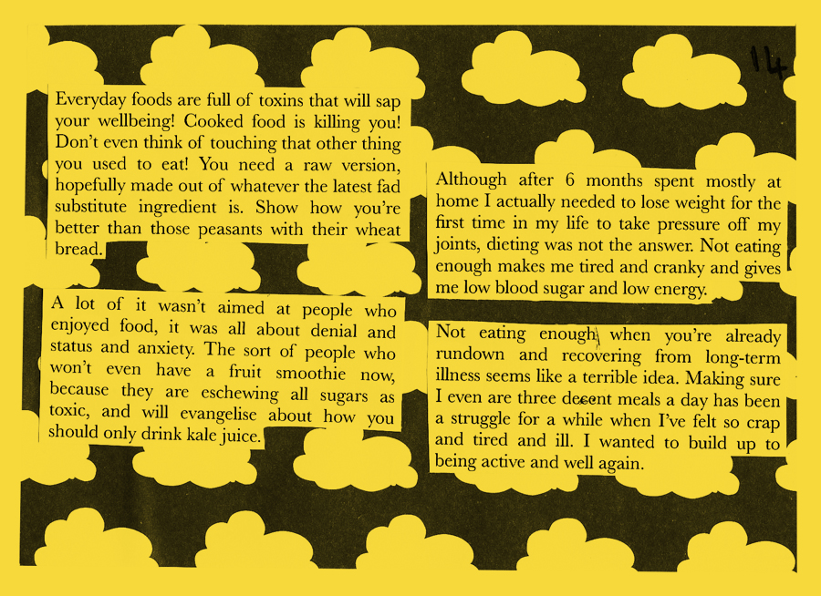 24 page 1/4 sized perzine on blue about trying to be healthier after long-term illness and realising how superficial and gross I find a lot of fitness and health culture. (Note- numbers related to weight or calories are never mentioned).
